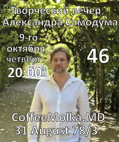 Девятого октября отмечает свой день рождения музыкант и композитор Александр Самодум. Праздновать он решил творческим вечером! Приходите и увидите, и услышите! Вход — пакетик кофе от Coffeemolka.md за 50 лей и донаты для артиста в знаменитую металлическую шляпу от Матвея Левинзона.